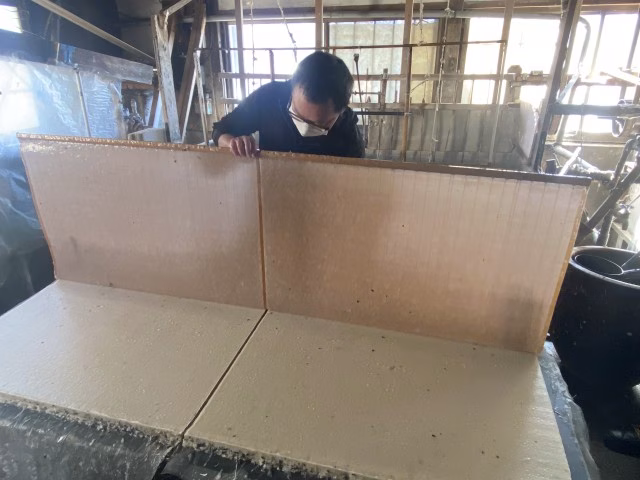 →作った紙を積み重ねて、しぼり、一枚ずつ張って乾かす