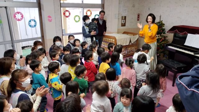 保育園の被害を知り、遠藤さんが寄贈を申し出たそうです。ピアノの贈呈を祝い、クリスマスツリーが飾られた園舎で、