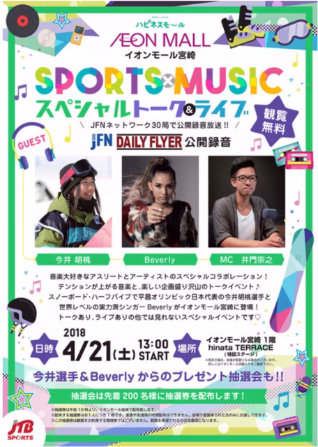 Sports×Musicと題し、水・木パーソナリティの井門宗之司会によるトークショーやプレゼント抽選会、さらにBeverly生ライブも開催予定です。