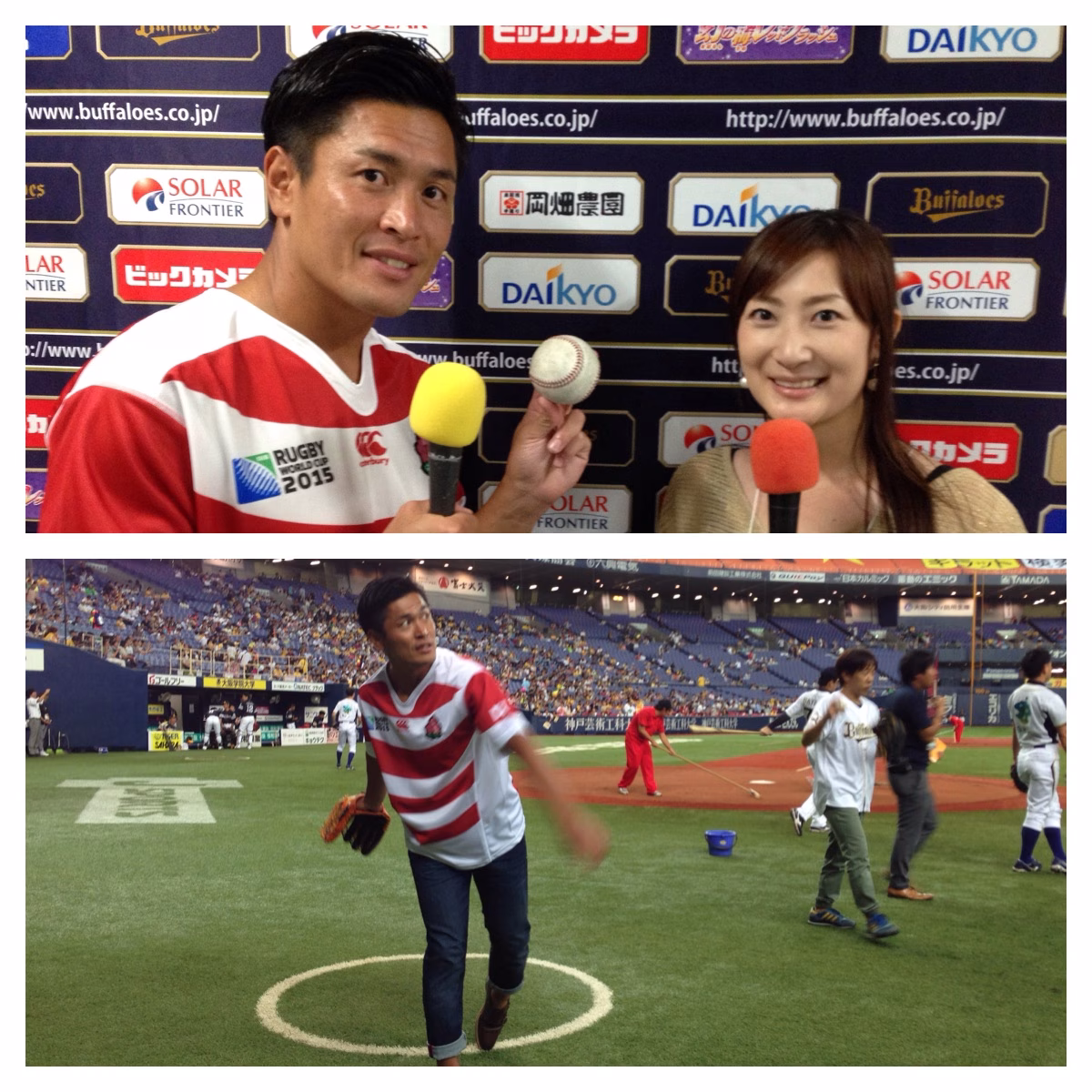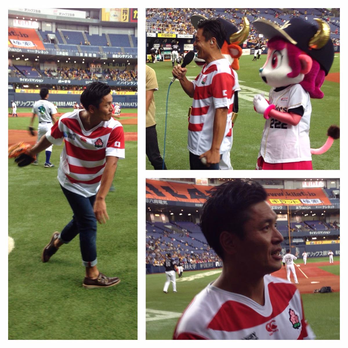 大畑さん、元ラグビー日本代表です。ユニフォームがよく似合っております。テンションも高め! 投げる角度も高め!?すでにこの時点で、 大畑さんに異変が…。