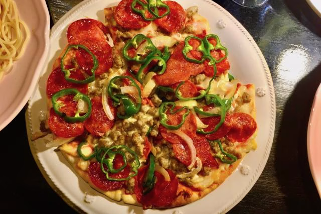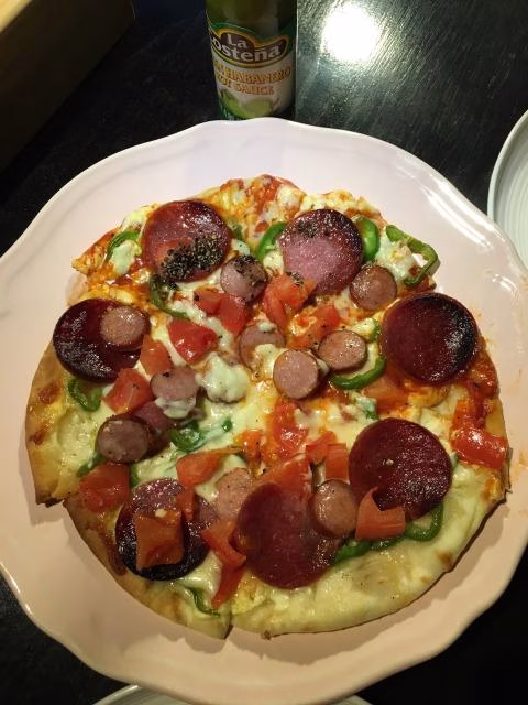 ピーマン、アスパラガス、サラミに イタリアン・ソーセージ・・・そして、チーズの かすかに焦げた 香りが・・・たまりません。スパイシー大好きな僕は、ハラペーニョを たっぷりと かけて・・・いただきまーす。