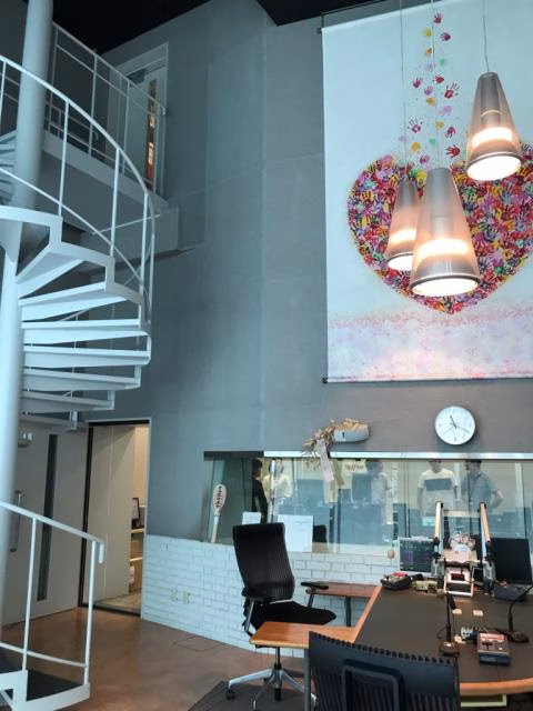 さて、FM福岡のサテライト・スタジオは螺旋階段もあるお洒落な雰囲気!