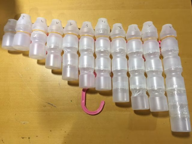 ⑤ 「ファ」と「ド」以外の細かい音は、ヤクルトのくびれになっているところの上を切って繋げることで、