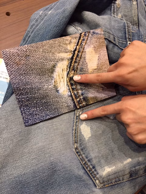 丁寧に修復する、繊細なお仕事。実際に修復したデニムを持って来て頂きました!