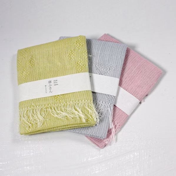 もちろん、OLNは小さな作品にもたくさんの思いが詰まっています。 お持ちいただいたのが「麻ふきん」 もともと、夏の帯をつくっていたとき、5メートルの中で一か所でも傷があると出荷できません。 もったいないと思った井上さんが小さく切って台ふきんにしたところ とっても使いやすいことが分かったんです。 さらに麻は濡らすととても強くなるのでごしごしこすっても大丈夫。 そして乾きやすいので嫌なにおいもしないんです