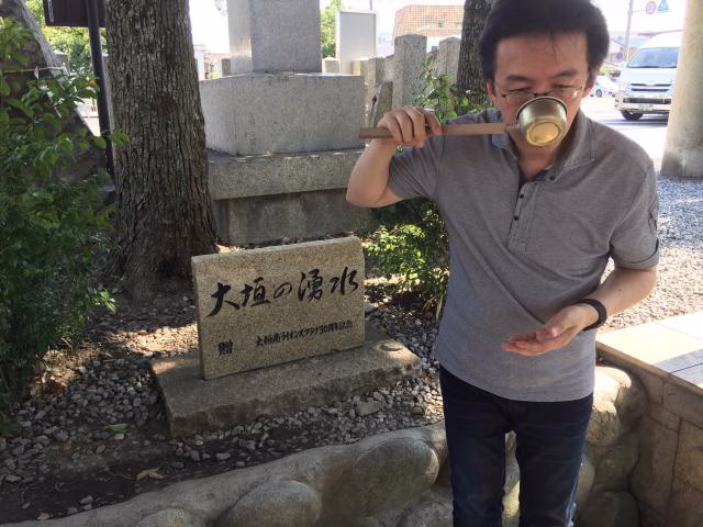 大垣のおいしい水を木マスに入れて、乾杯!!!ヒノキの良い香りの中で飲むのが非常に美味しいんです♪大垣は日本の真ん中に位置し、東西要衝の地。