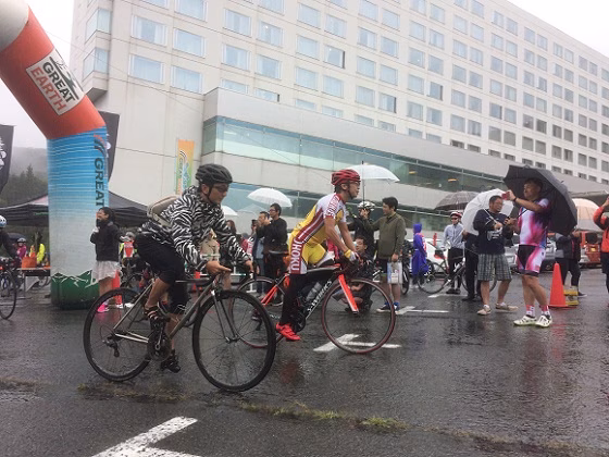 朝7時のスタートということで、5時には起床して外を見ると、なんと雨。東北エリアは秋雨前線が通過中。しかも結構降っている…。早朝から実行委員会の皆さんが協議した結果、安全を考慮してロングライドは中止し、約60kmを走るショートライドのみの実施となりました。