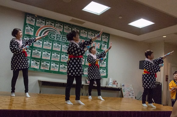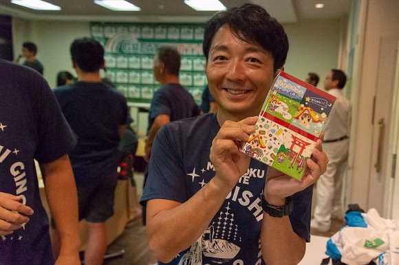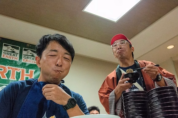 結果は……惜しくも優勝は逃しましたが、なんと20杯も食べる堂々としたもの。最後にちょっとしたハプニングもありましたが、会場が一体となって盛り上がりました。その後は、地元の演舞を皆と踊ったり一般参加者と記念撮影をしたり、最後のじゃんけん大会まで、終始リラックスモードで前夜祭は終了。翌日に備えて、この日は早めに休みました……かな?(笑)>>後編につづく