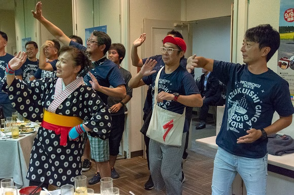 イベント前日には、参加者やスタッフ100名ほどが集まって親睦を深める「前夜祭」が開催されました。司会はこのイベントではおなじみの白戸太朗さんと平野由香里さん。お二人ともライダーですので、自転車乗りの気持ちもよくわかる!ということで、参加者とも和気あいあいで進行されていました。