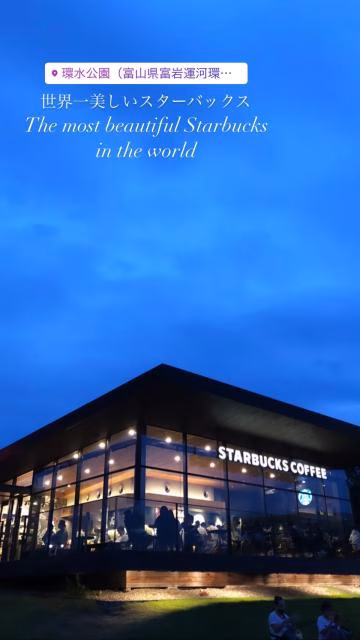 富岩運河環水公園にて野島:先ほどの「CAFE&BAR OYATSU」から20~30kmくらい走って、この2日間の富山のゴール地点、富岩運河環水公園にやって参りました。皆さん、お疲れ様でした!福田:ありがとうございました。勝:もう富山駅の前ですよね。伊藤:すっかり暗くなりましたね。野島:実は、つい数日前からライトアップが始まったようで、めちゃくちゃキレイ!伊藤:逆に、この暗い時間に着いて良かったですね。勝:そうですね。トワイライトな感じで。野島:パッと振り向くと、“世界一美しい”スターバックスが。福田:確かに、すごく気持ち良いですね。高い建物がないから、お空が広く見えるし、芝生もあって、水もあって。