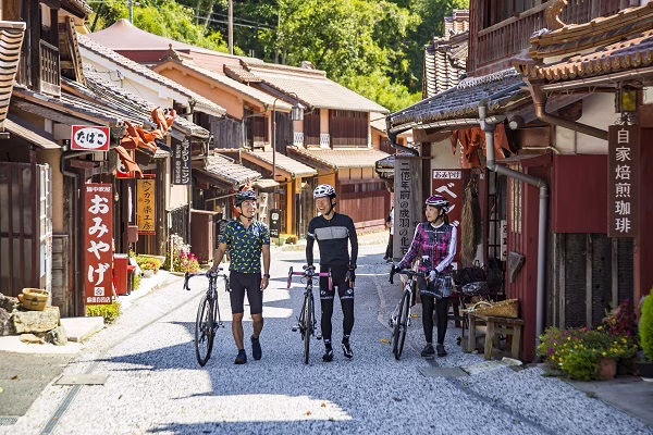 最初に2人が向かったのは、石州瓦とベンガラ色の外観で統一された、歴史的町並みが残る吹屋ふるさと村。「日本人のDNAに刻まれているのでしょうか。懐かしさや心地良さがズンズンくる。ちなみに、野球はDeNAファンです。横浜出身なもので(栗村さん談)」「途中が斜度2〜3%のゆるやかな登り坂で、優しめのヒルクライムコースを走ります。ヒルクライム大会にも使われるそうなのですが、ウォーミングアップといいますか、気持ち良く走れる登り坂でした。石州瓦はレンガみたいな赤さで、ものすごく印象的で綺麗でした(野島談)」