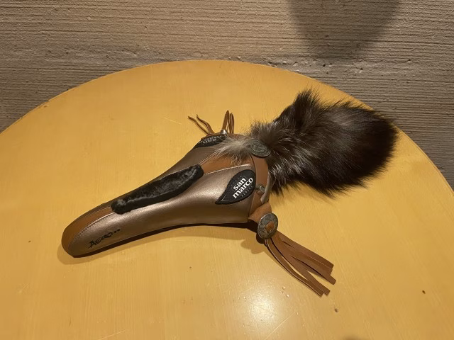 ◆10年前に購入も…1度も日の目を見ないサドル野島:実用性はともかく、見ているだけで“お酒が飲める!”というお酒のつまみになっちゃうような自転車パーツ(https://tfm-plus.gsj.mobi/news/FyqubootQE.html)が、僕にとってはあるんです(笑)。いままで、宝石のようなものが付いたブレーキ、見た目が美しいハブ、などを紹介してきましたが、今日紹介するのは「尻尾(しっぽ)付きサドル」です。「は?」って感じで意味不明ですよね(笑)。どういうものかと言うと、サドルの後ろの部分に30cmぐらいの長さのリアルファーのしっぽが付いているんです。このサドルを作ったのは「selle san marco(セラ・サンマルコ)」というイタリアのメーカー。プロ・ロードレース界でも有名で、1935年創業の歴史ある一流のサドル・メーカーです。そんな(老舗)メーカーが、なぜこんな変わったサドルを作ったのか。おそらく“お遊び”で作ったんじゃないかなと。しっぽを取ってしまえば、プロも使えるようなロードバイクに取り付けるサドルの形をしています。なぜしっぽを付けたのか、なぜ金属やレザーの装飾を施したのかは、まったく意味不明です(笑)。中央の部分にはちゃんと穴も開いていて、股間の部分を痛めないようなプロ仕様になっています。しかも僕は、これを買っちゃっていますから! だから、いまここにあるんですけどね。これは10年前ぐらいに買ったのですが、自転車に取り付けたことはありません。なぜかと言うと、とんでもない欠点があるんです。(取り付けると)しっぽが後輪に引っかかるんですよ(笑)。コレクションとして自宅の部屋の壁にぶら下げていたこともあるんですけどね。10年間、“どうにかして使ってやりたいな”と、ちょくちょく思っては妄想を重ねて……それこそお酒を飲みながらこのサドルを眺めて、“どう使えば活かせるだろうか”と想像して。まず、最新のカーボンバイクには似合わないだろうと。鉄製の昔ながらの「クロモリ」なら似合うのかなと思いつつ……ここは、あえて攻めて、竹で作られたロードバイクがあるんですけど、竹のフレームのナチュラルな感じが合うんじゃないかなと。そう思ったのですが、(しっぽが)後輪をこするという最大の問題は解消しないので、竹のフレームを買うのはちょっと躊躇しています(笑)。でも、この後輪をこする問題の解決方法を思いつきました! 小径車、ミニベロのホイールが小さいタイプの自転車だったら、しっぽが届かないのでこすらないんですよ。なので、竹で作られたミニベロのフレームができたら買って取り付けてみようと妄想を重ねています。