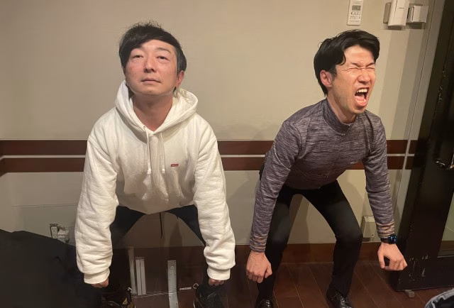 “筋トレ”でバーベルを挙げるポーズを取る野島裕史、栗村修さん