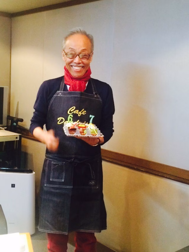 と、そんな時…ふと気づいた。 「caféダンディズム」…そうだ、マスターはcaféのオーナーであり 大のお料理好き!だということを。 ならば、コレっきゃない! そう、エプロンだー! ということで、オリジナルのロゴを入れたエプロンを プレゼントさせていただきました~デニム地に刺繍で「caféダンディズム マスター」と 入れていただいた逸品。 マスター、とってもお似合いです♡ (後日、マスターのスタッフさんに伺ったところ、 マスター、かなり気に入って下さってご自宅のキッチンに ちゃんと置いて下さっているとのこと。う~嬉しい(T_T))という、おめでとうマスター♡一色の今週でした。あらためまして、谷村マスター! お誕生日おめでとうございます。 これからも、ますますお元気で、そしてダンディーな、 可愛い~マスターでいて下さいネ♡谷村新司の「caféダンディズム」 来週も元気に開店します(^O^)/