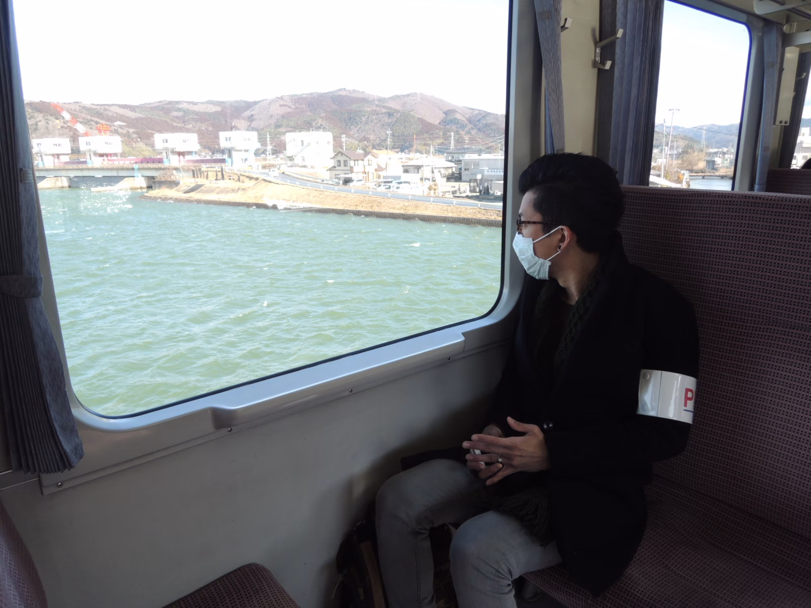 井門「なんだか感慨深いね…。去年来た時はまだ電車が開通してなくて。 いつも石巻からは車でしか行けなかったんだもんなぁ。」佐々木「そうですね。あっ、ほらこっちの席からの方が海がよく見えますよ。」車窓から眺める外の景色。風はとても強く吹いているが、その風向きは追い風だ。そして電車はいよいよ浦宿から女川へ。 最後のトンネルを抜けると、あの独特の形をした『女川駅』が見えてくる。旅の日記はこちらから旅の動画はこちらから