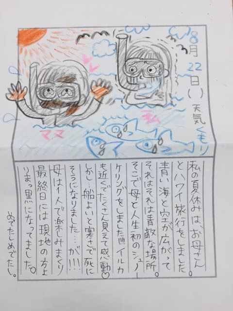 私の夏休みは、お母さんとハワイ旅行をしました。青い海と空が広がってそれはそれは素敵な場所。そこで母と人生初のシュノーケリングをしました!!!!!
