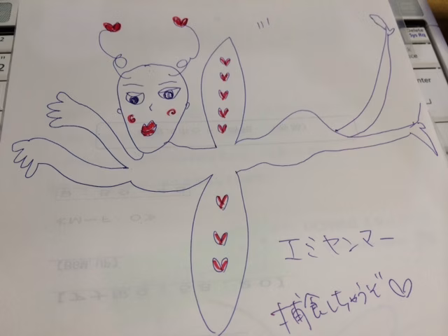 本日もたくさんのメッセージ、誠にありがとうございました! 各地で様々なお祭りが行われる暑い季節、 お祭りで最高のパフォーマンスができる様に、 そして、暑さに負けず、日々の生活を頑張れる様に・・・そんな時の1本♪♪ アワラーイズッッッ!!!♪♪♪そして、そんな暑さにやられてしまったのか、 突然メールが読めなくなってしまった森藤さん(笑) そんな森藤さんが描いた「エミヤンマ」の絵。 ・・・ヤバイです。破壊力があります!!!!(笑) 明日は蒲田さんが戻ってきますよ♪♪メッセージ、お待ちしています!そして、来週1週間は「夏」をテーマにリクエストを大募集☆ リクエストした理由と、住所、氏名を忘れずに書いて送ってください♪♪ 採用された人全員に、「Twitter限定ハピモニレンジャーステッカー」を5種類セットにしてプレゼントします! おつかれサマーリクエストは既に受付中です! 気軽に送ってください♪♪全てメッセージには住所・氏名を忘れずに明記の上、 メールはメールフォームから(スマホからでもOK!)→http://site.jfn.co.jp/oh/mailform/79 FAXは03-3288-8955からお送りください♪♪ 携帯から送る人は絵文字&カナ小文字禁止よ♪♪文字化けしちゃうからね♪♪ メッセージはtwitter(#hapimoni)でも受け付けてます♪♪