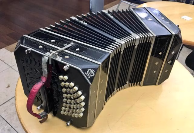 このボタンも、象牙と貝殻でひとつひとつ作られているものなんです。そして、このバンドネオンという楽器、さまざまな経緯があって、