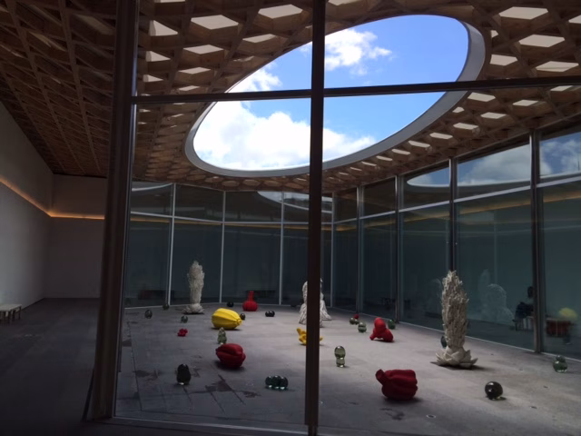 大分県立美術館、通称OPAM(オーパム)。 この春オープンした気持ちいい美術館の天井に、穴が!! 穴から空模様を見上げながら、自然のアートが楽しめます。