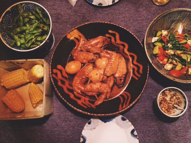 この季節、枝豆とトウモロコシは必須。メインは手羽先と卵の甘・酸っぱ・辛な煮込み。お、おいしそ〜〜…