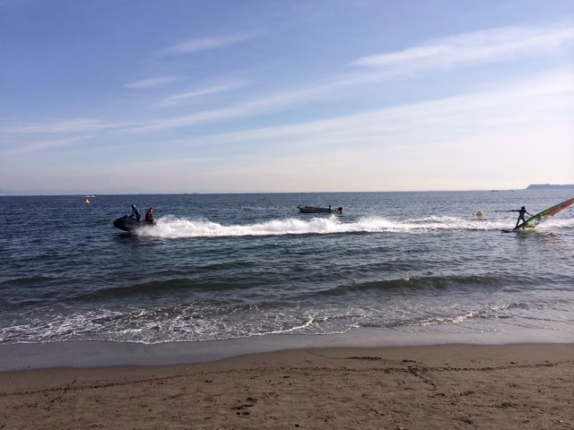 ウィンドサーフィンの大会にて デモンストレーション。 風がないのでジェットど引っ張って 片方はウィンドサーフィンのリグ もう片方はジェットのロープ。 かなりのスピードからの~ 横回転ダブル!! ハンパないっす!