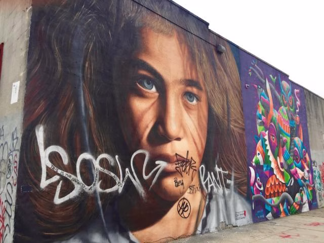 でも10メートルも歩かないうちに、建物の壁いっぱいに描かれたカラフルな巨大アートが目に飛び込んできます。右も左も建物の壁という壁、全部がアート。