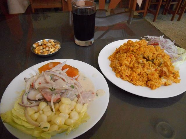 (ペルー料理のセビチェ(←)と、アローズコンマリスコス)この2週間は…前回電話を繋いだチリのサンティアゴ、アルゼンチン・メンドーサ、