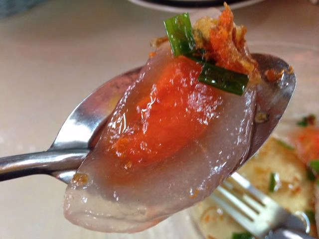 タピオカの粉で皮を作っているらしく、皮は透明でツヤツヤと輝いています。