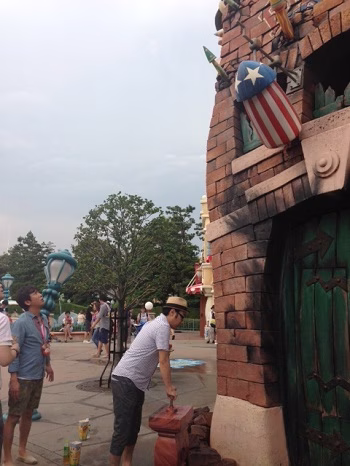 トゥーンタウンの中にあったなにやら面白そうな仕掛けで遊ぶ豊本さん。 思いっきり上むいちゃってますよー。笑