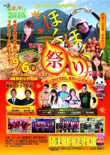 そしてそして、北海道の広大な大地で! プロレスカーニバルというイベントを開催しちゃうそうです!男女シングルマッチ各1試合 男女混合タッグマッチ1試合 チョップ王座決定戦などなど。雄大な環境と男たちの汗が滴るプロレスマッチ。 すごい祭りになりそうです。人口約2,100人の真狩村が、このお祭りには倍以上の約5,000人の 人たちが集まりまるんだそう。 ぜひ、みなさんも真狩村を盛り上げにいきましょう!