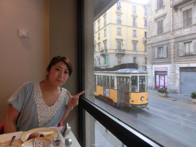 オシャレな街:ミラノ ホテルの朝食レストランのすぐ横を トラムが走ってゆくのが見える!