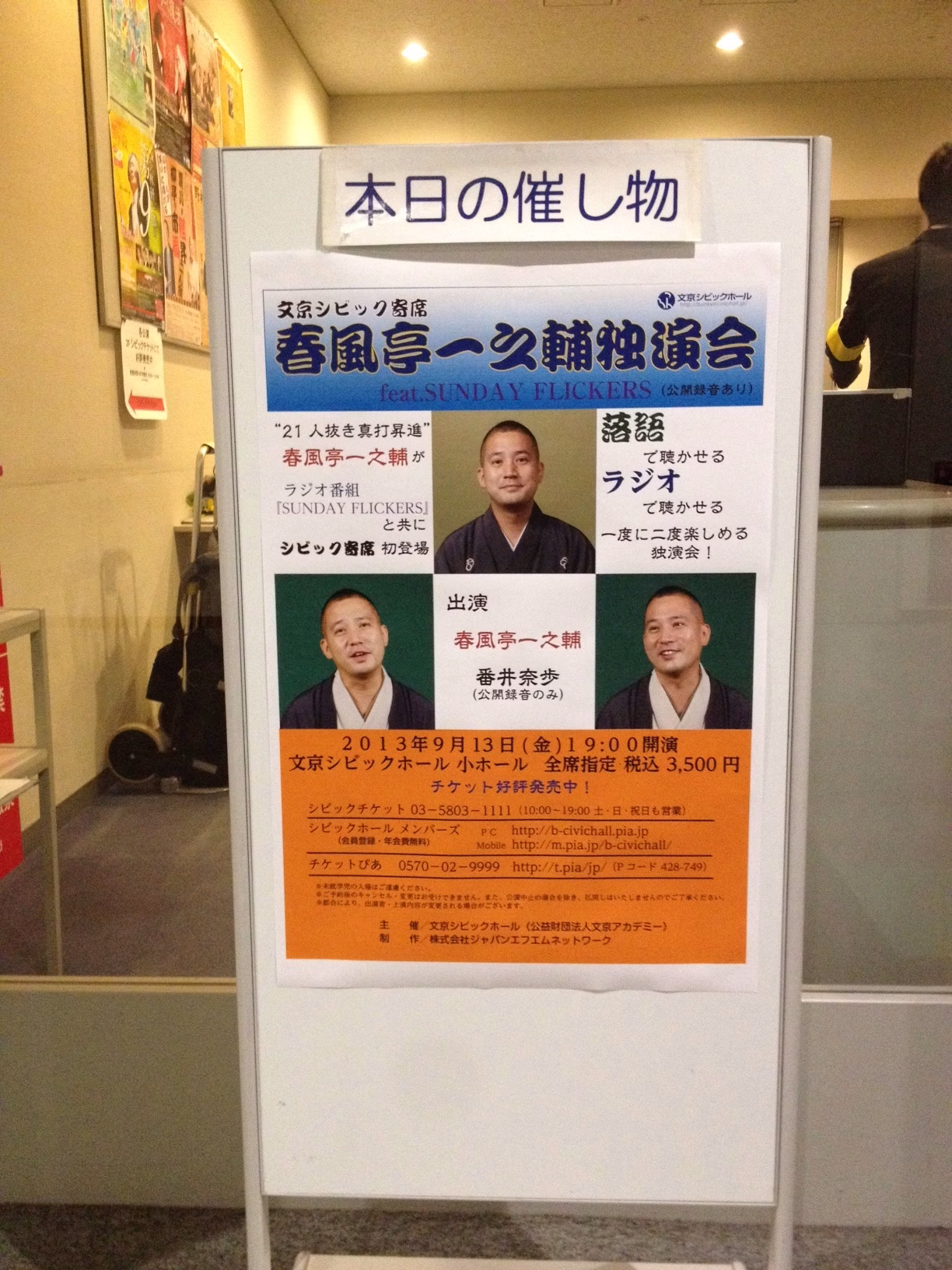 今日は文京区シビックホールでサンフリ公開録音がありました!!お越しになってくださった皆さんありがとうございました! お客さんと顔を合わせてのメッセージ紹介コーナーは、 とっても新鮮でした!今回の模様は、あさって 9月15日AM6:00~から放送のサンデーフリッカーズ (下記のネット局をチェック!)と、 ホームページのサンフリポッドキャスト(17日火曜更新予定) でお聴き頂けます! ぜひ、日曜日は朝から二人の軽妙なトークをお楽しみください!!またエリア外だけど、サンフリをオンエアで 聴きたい!と思ってくださっている方! スマートフォン用アプリ、 『ドコデモFM』でお聴きになれます! ぜひチェックしてみてください! http://www.docodemo.fm/pc/index.html