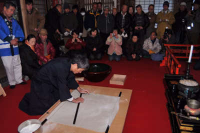 さあ、そんな苦労して作ったお蕎麦は、 滝の霊水に浸すことにより、そばのアクが抜け、舌触りの良い、 ツルツルモチモチとした食感になり、通常のそばよりほのかな甘みが増す! と最高の味!この日を境に徐々に食べられるお店も増えるそうなので、 ぜひチェックしてみてください!!イベントのHPはこちらです! →http://www.kuranomachi.jp/event/2013/01/2013nenn.php