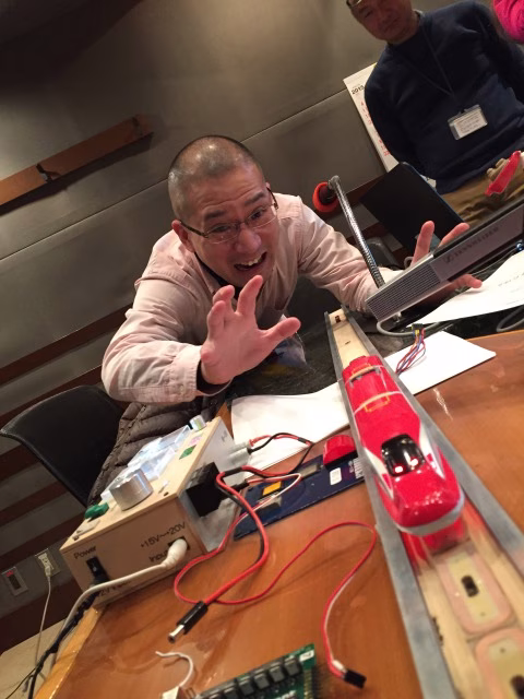 2枚目は、リニアモーターカーを襲う一之輔さん。 興味津々でした!!