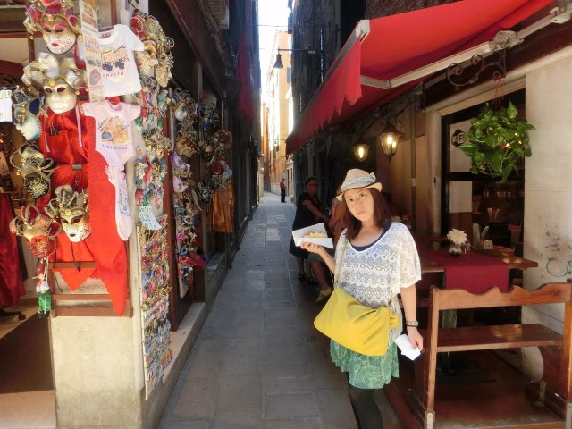 ベニスの路地は、おみせがたくさんあって 楽しかったですよ☆ ベネチアンのマスク(写真向かって左)も キレイで非常に惹かれるのですが 帰ってからの使い道が見つからないまま ベネツィアをあとにしたのでした。