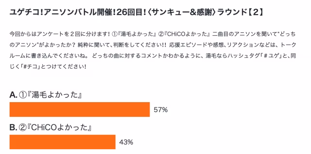 番組一覧 > ニコラジパーク【湯毛、CHiCO】火曜日 > お知らせ > 第26回 ユゲチコアニソンバトル!勝者は…??