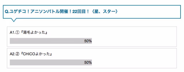 番組一覧 > ニコラジパーク【湯毛、CHiCO】火曜日 > お知らせ > 9/22 第22回 ユゲチコアニソンバトル!勝者は…??