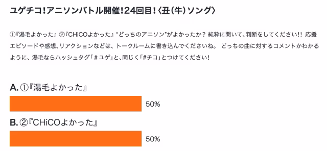 番組一覧 > ニコラジパーク【湯毛、CHiCO】火曜日 > お知らせ > 第24回 ユゲチコアニソンバトル!勝者は…??