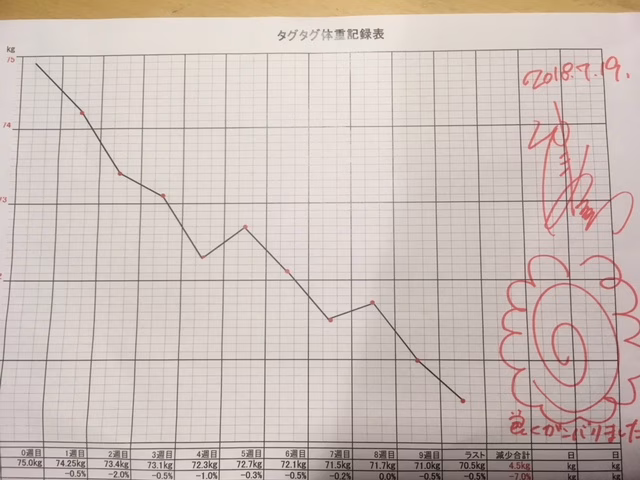 トークルームへのたくさんの書き込み、ありがとうございました!今夜のアキラズテーマは「靴下を選ぶ基準」でしたが1位は①『柄』でした~~そしてアキラ君は⑤『生地』でした~厚手の靴下が好きなんですって。そしておよそ2か月続けたタグタグ・ブートキャンプの結果ですが・・・見事体重-4.5Kg 体脂肪率-7%となりましたー!続けたかいがありました。いやマジで本当成果出てよかったこちらがタグタグ体重表となっております。
