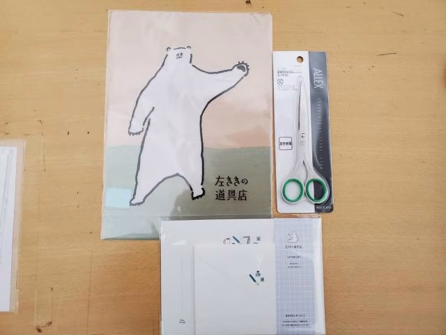 左ききの道具店のクリアファイル・はさみ・レターセット。