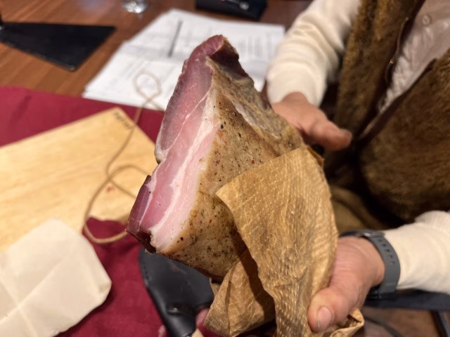 長野さんが得意とする焚き火料理が、燻製ベーコン!