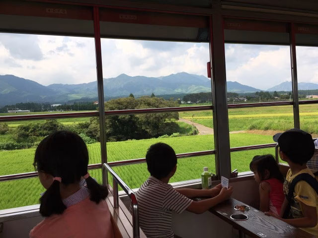 南阿蘇の風景と車掌のオリジナルガイドが楽しめ、