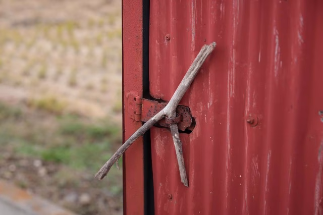 南京錠を通す穴に、木の枝を差して戸締りをしています。