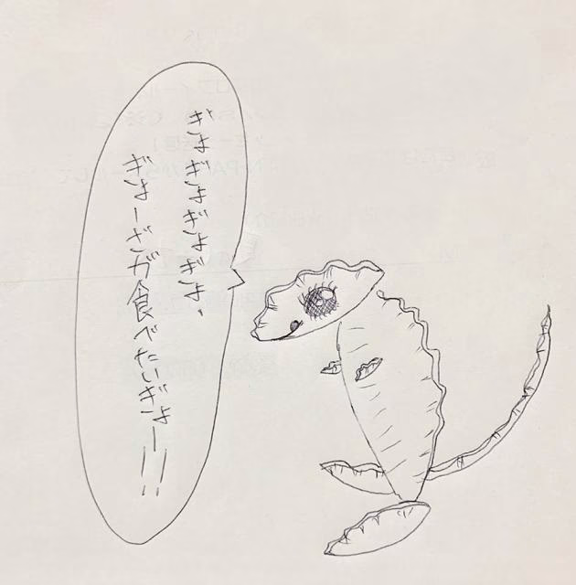 口癖:ぎょぎょぎょぎょーざが食べたいぎょー!!阪本の画力を存分に活かして描き上げたゆるキャラ「しょーごん」がこちら!