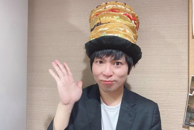 和菓子屋さんの取材のときにパンケーキの帽子をかぶってると