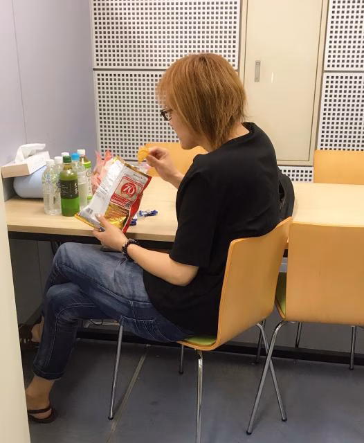 スタジオに到着後、そっこーでポテチの袋を開封!!一口食べて「うめぇえええええ!」