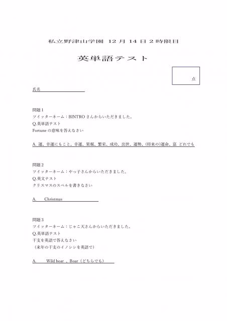 野津山幸宏の私立野津山学園 第2回目 テスト問題と解答