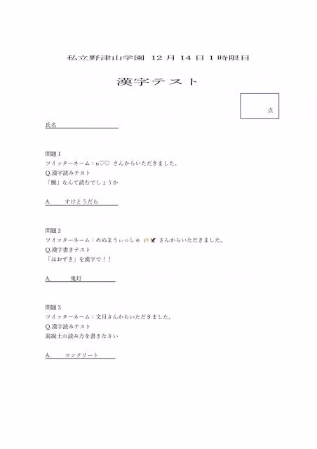 野津山幸宏の私立野津山学園、第2回目の配信いかがでしたか?皆様、沢山の問題ありがとうございました。テストは