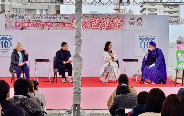 2人目のゲストは、大垣市長の石田仁さん。 地元のデザイン学校で手作りされた袈裟をまとい、松尾芭蕉になりきってのご登場です。その姿を見た桂里奈ちゃん、「ゆるキャラみたいですね!」と、一言。なごやかなトークが続きます。