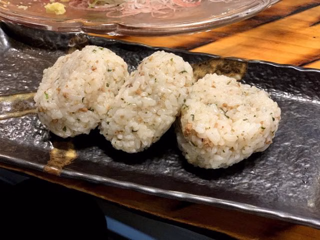 熟成肉をミディアムレアにローストし、焦がしにんにくとマヨネーズで味付けした一品。牧野さん「コショウとにんにくが効いててメッチャおいしい!鯨を食べたことない人にもおすすめです!」「鯨のおにぎり」